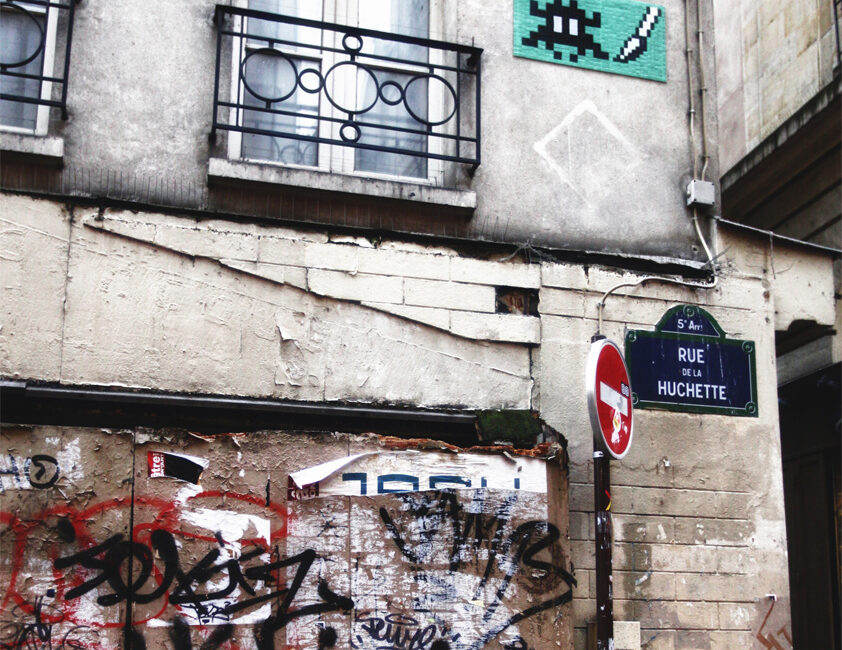 While walking down Rue de La Huchette in Quartier Latin, I noticed a familiar character beneath the street sign. Being a child of the ’80s, there was no mistaking the colorful mosaic as anything other than Space Invaders!